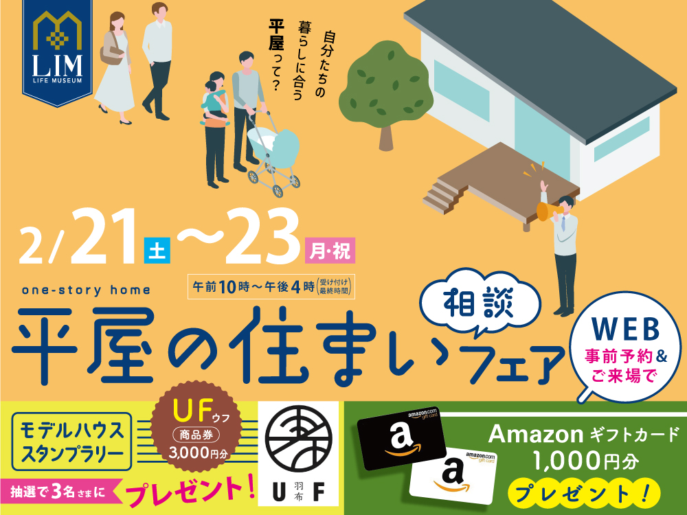 ライムのハウスメーカーで平屋の実例紹介が聞ける3日間限定の特別なイベントを開催します。事前予約でうれしいプレゼントもご用意!詳細はイベントページよりご確認ください♪